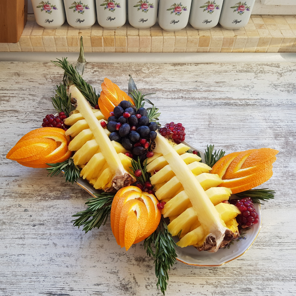 Добрый вечер, дорогие друзья! В Сибири температура опускается всё ниже, и даже многие школьники остаются дома. И чтобы усмирить завывание вьюги, поднять настроение и получить дополнительную порцию витаминов, я предлагаю оформить фруктовую тарелку и красиво нарезать ананас и апельсин. Для оформления нам понадобятся: 1/2 ананаса, 1 апельсин, 1 гранат, черный виноград и веточки розмарина. Приготовление: ананас вымыть и обсушить бумажным полотенцем. Разрезать ананас на 4 части, включая макушку. Выполнить разрез на четвертинке ананаса, отделив жесткую сердцевину, но не отрезая её полностью. Надрезать мякоть ананаса снизу и с боков до крепления к сердцевине с одной стороны. Также надрезать мякоть с другой стороны. Вынуть вырезанную мякоть ананаса. Нарезать мякоть на пластинки. Вставить пластинки мякоти обратно, смещая их попеременно относительно центра. Вторую четвертинку нарезать таким же образом. Помыть и протереть апельсин. Разрезать апельсин на четыре части. Надрезать апельсин вдо