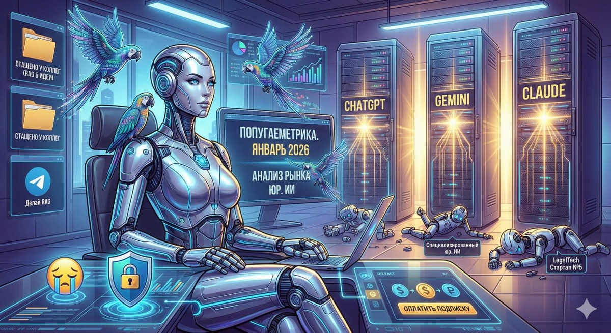Январь 2026. Знайте, уважаемые коллеги, считаю совершенно незазорным "стащить" умные мысли у других юристов. Можно даже отдельный телеграм-канал организовать - "стащено не только у Хольгера". Вот например ссылка на методически обоснованную попугаеметрику. Более мощно упакованное исследование (не считать же мои субъективные оценки за истину?) я пока ещё ни у кого не видел, соответственно сразу же подписался на тг "Делай RAG". Исследование не поленился прочитал, мой коммент-заметка будет такой. Имею гипотезу, что тяжёлые общепотребительские модели всё же будут в лидерах. Массовое увлечение "якобы специализированными юридическими" нейронками с отдельными сверху накручиваемыми подписками по состоянию на первый квартал 2026 года смысла не имеет. В общем итоге плачем и платим и за квн и за чатгопоту (впн и классику - chatgpt , gemini, claude). #заметка #попугаеметрика Генарт от Gemini , а вот промпт я вам не скажу.