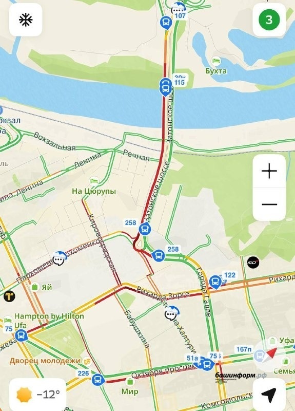 В Уфе днем 16 января встало движение на Затонском шоссе. Гигантская пробка сковала участки улиц Рихарда Зорге, Пархоменко, Кировоградской, а также проспекта Октября. Локальные затруднения на дорогах города возникли из-за ДТП. Ранее «Башинформ» информировал о том, что водитель за рулем большегруза «Ивеко» (трал-прицеп) при движении по улице Пархоменко, подъезжая к Затонскому кольцу, допустил падение груза, емкости для газового конденсата весом 26 тонн, на автомобиль «Рено Логан». Легковушка ехала по Затонскому шоссе в направлении улицы Рихарда Зорге. В ДТП никто не пострадал.