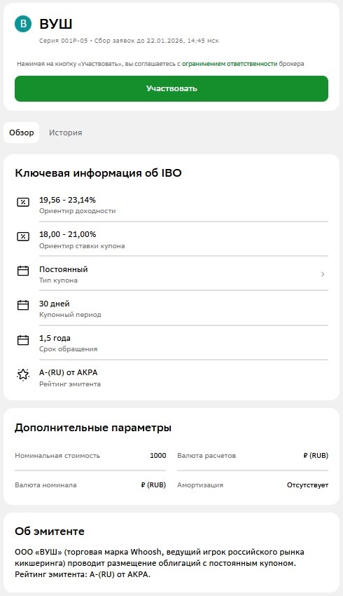 Подали заявку брокеру на покупку облигаций ВУШ-001P-05 (кредитный рейтинг А-), которые начнут торговаться с 27.01.26. Ориентировочный фиксированный годовой купонный доход 18% - 21%. Срок погашения 21.07.27.