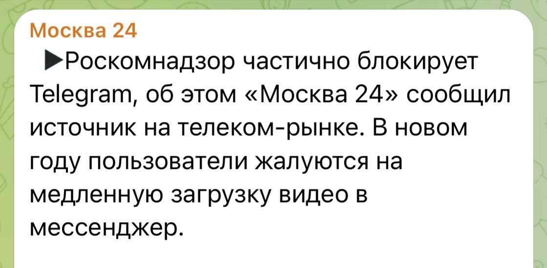 Телеграм начали частично блокировать — сообщает Москва 24, ссылаясь на анонимный источник.