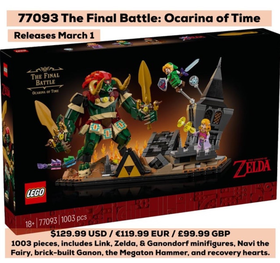 Набор представляет собой миниатюру сцены, в которой Линк и Зельда сражаются с Ганондорфом. Конструктор, в который войдёт 1003 детали, выпустят 1 марта.
