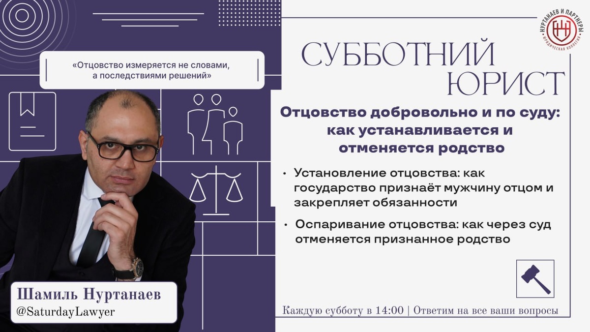 ? Об этом и о многих других вопросах мы поговорим завтра 17 января на очередной трансляции "Субботнего Юриста" ⚖️ Эфир проведет юрист с более, чем 20 летней практикой – Шамиль Нуртанаев (нажав на имя вы можете узнать о юристе больше). Тема эфира: «Отцовство в праве» 📝 Вот основные вопросы, которые мы обсудим в эфире: 1. Установление отцовства: как государство признаёт мужчину отцом и закрепляет обязанности 2. Оспаривание отцовства: как через суд отменяется признанное родство Также, каждый может задать свой вопрос любым удобным для вас способом, перейдя по ссылке: https://clck.ru/3ByDxh Или же просто напишите вопрос в комментариях к посту Получите юридическую консультацию, не выходя из дома! 🎥 Записи эфиров на нашем Rutube: https://rutube.ru/channel/40148985/ VK Видео: https://vk.com/video/@vk.nurtanaev Дзен: https://clck.ru/3DQGpA ⚡️⚡️⚡️⚡️Трансляция пройдет на платформе VK Видео и Rutube, по ссылкам ниже👇 ✅ Присоединяйтесь к эфиру 17 января 2026 года в 14:00, будет интере