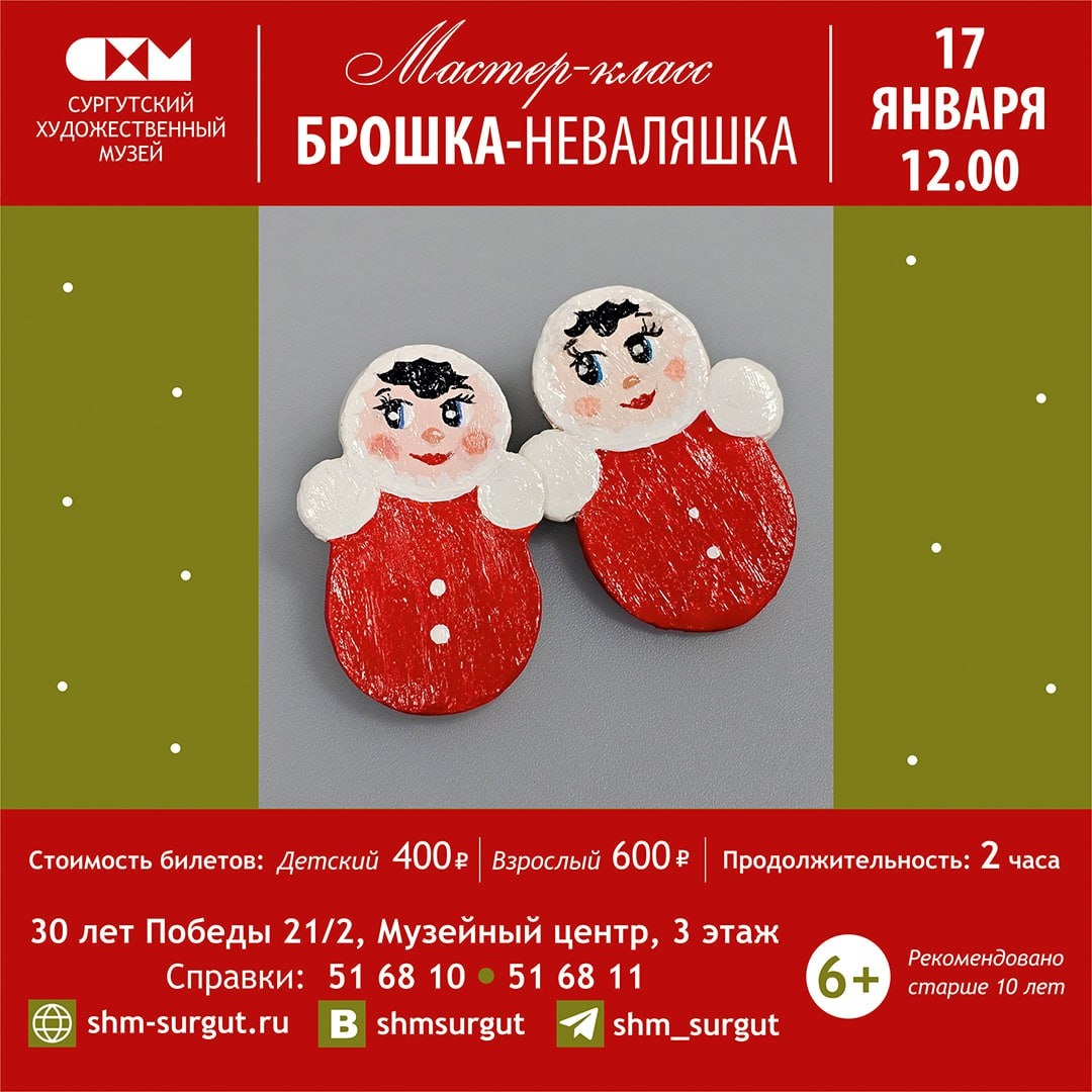 🎈 Сургутский художественный музей приглашает посетить мастер-классы и экскурсии: 17 января, 12:00 Мастер-класс «Брошка-неваляшка». Лепка и роспись изделия из самозатвердевающей глины. Стоимость билетов: Дети – 400 руб, взрослые – 600 руб. Продолжительность: 2 часа. Рекомендовано для участников старше 10 лет. 18 января, 14:00 «Маленькая страна». Интерактивная экскурсия по выставке «КУКЛЯНДИЯ. Новое пространство». Стоимость билетов: Детский (4-6 лет) – 50 руб, детский (7-18 лет) – 100 руб, взрослый – 200 руб. Продолжительность: 45 минут. Предварительная запись: по телефону 51-68-11, электронной почте shm.1otdel@yandex.ru 🎟 Билеты в кассе МБУК «Сургутский художественный музей» и на сайте: https://shm-surgut.ru/ Историко-культурный центр Старый Сургут приглашает посетить мероприятия: Мастер-классы 17 января, 11:00 – 12:00 Мастер-класс по изготовлению сережек из бересты в смешанной технике. Стоимость: 350 руб. Возрастная категория: 12+ 17 января, 12:00, 14:00 Мастер-класс «Шек