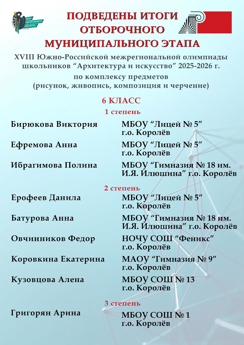 предметов (рисунок, живопись, композиция, черчение) 2025-2026. Олимпиада входит в перечень олимпиад школьников на 2025/2026 учебный год под №3. (Приказ Министерства науки и высшего образования российской Федерации №669 от 30.08.2025 (об утверждении перечня олимпиад школьников и их уровней). Мы поздравляем победителей и желаем успехов на очном региональном этапе, который состоится 14 января 2026 года - номинация "Рисунок", 21 января 2025 года - номинации "Живопись, композиция" на площадке олимпиады в МАУДО «Центр художественного мастерства» г.о. Королёв. #ЦХМ_Королев #мероприятия_Королев #маудоцентрхудожественногомастерства #королевобразование #НацПроектОбразование #УспехКаждогоРебенка #ЮРМОШ #олимпиада #детиКоролева