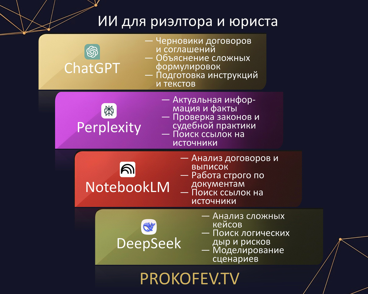 Коллеги, давайте внесем ясность. Сейчас из каждого утюга кричат про «ИИ», но в каждой сделке на кону — миллионы и репутация. Если вы хотите внедрять технологии в работу риэлтора или юриста, пора перестать путать мягкое с теплым. Все генеративные модели — это нейросети, но далеко не каждая нейросеть годится для работы с документами. Наведем резкость на три уровня инструментов для практики: 1️⃣ Искусственный интеллект (экосистемы) Это ваш «цифровой офис». Платформы, где ИИ — это огромная совокупность технологий, а не просто чат. 🔹 Зачем: быстрый поиск по открытым базам, планирование, общие справки. 🔹 Инструменты: Алиса AI, GigaChat, Google AI Studio 2️⃣ Нейросети (аналитики) Ваши «цифровые помощники-стажеры». Они не придумывают новое, они пашут с вашими данными: анализируют, сопоставляют, ищут риски в загруженных файлах. 🔹 Зачем: «прогнать» договор на 50 страниц или выписку из ЕГРН на предмет ошибок и нестыковок, транскрибировать аудио 60-ти минутной консультации 🔹 Инструменты: Plaud