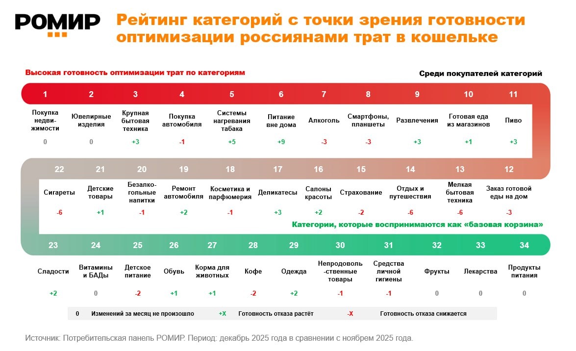 Анализ за декабрь 2025 года выявил заметные сдвиги в потребительском поведении россиян по сравнению с предыдущим месяцем: - в наибольшей степени повысилась готовность оптимизировать расходы на питание вне дома и системы нагревания табака; - в то же время снизилась готовность экономить на мелкой бытовой технике, отдыхе и путешествиях, а также на покупке сигарет. 🟢 «Зелёная зона» рейтинга: базовые категории, от которых россияне не готовы отказаться В топ‑3 традиционно вошли: продукты питания, лекарства и фрукты. К числу важных для россиян категорий также относятся: средства личной гигиены, непродовольственные товары, одежда, кофе, корма для животных, обувь, детское питание, витамины и БАДы, сладости. 🟡 Середина рейтинга В середине рейтинга произошло снижение готовности оптимизировать расходы на такие категории, как: сигареты, отдых и путешествия, мелкая бытовая техника, услуги страхования. Вместе с тем, отмечается готовность россиян экономить на деликатесах, посещении салонов к