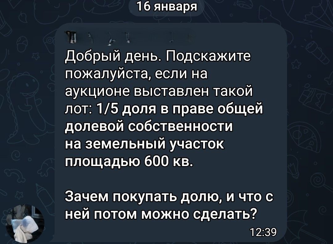 ! 🗣В нашем бесплатном чате телеграм-канала один подписчик задал интересный вопрос: Зачем на торгах покупать 1/5 долю в праве собственности на земельный участок и что с ней потом делать? ⚠️ Покупка микродолей в большей степени относится к спекулятивной стратегии и входить в нее можно если у вас есть определенный опыт и ресурсы. Итак, почему на торгах покупают малые доли? 1️⃣ Низкая цена старта: Малая доля часто продается на торгах дешевле, чем оценивается рынком, потому что спрос на такие доли низкий. 2️⃣ Стратегический контроль: Накопление малых долей создает рычаг давления на крупных сособственников, заинтересованных в консолидации участка. 3️⃣ Пассивный доход от выкупа: Если правовой анализ показывает, что доля признается незначительной, можно ожидать, что сособственники инициируют принудительный выкуп через суд с выплатой вам компенсации по рыночным ценам. 4️⃣ Спекуляция на росте цены земли: Даже 1/5 доля растет в цене пропорционально основному участку, если участок располо