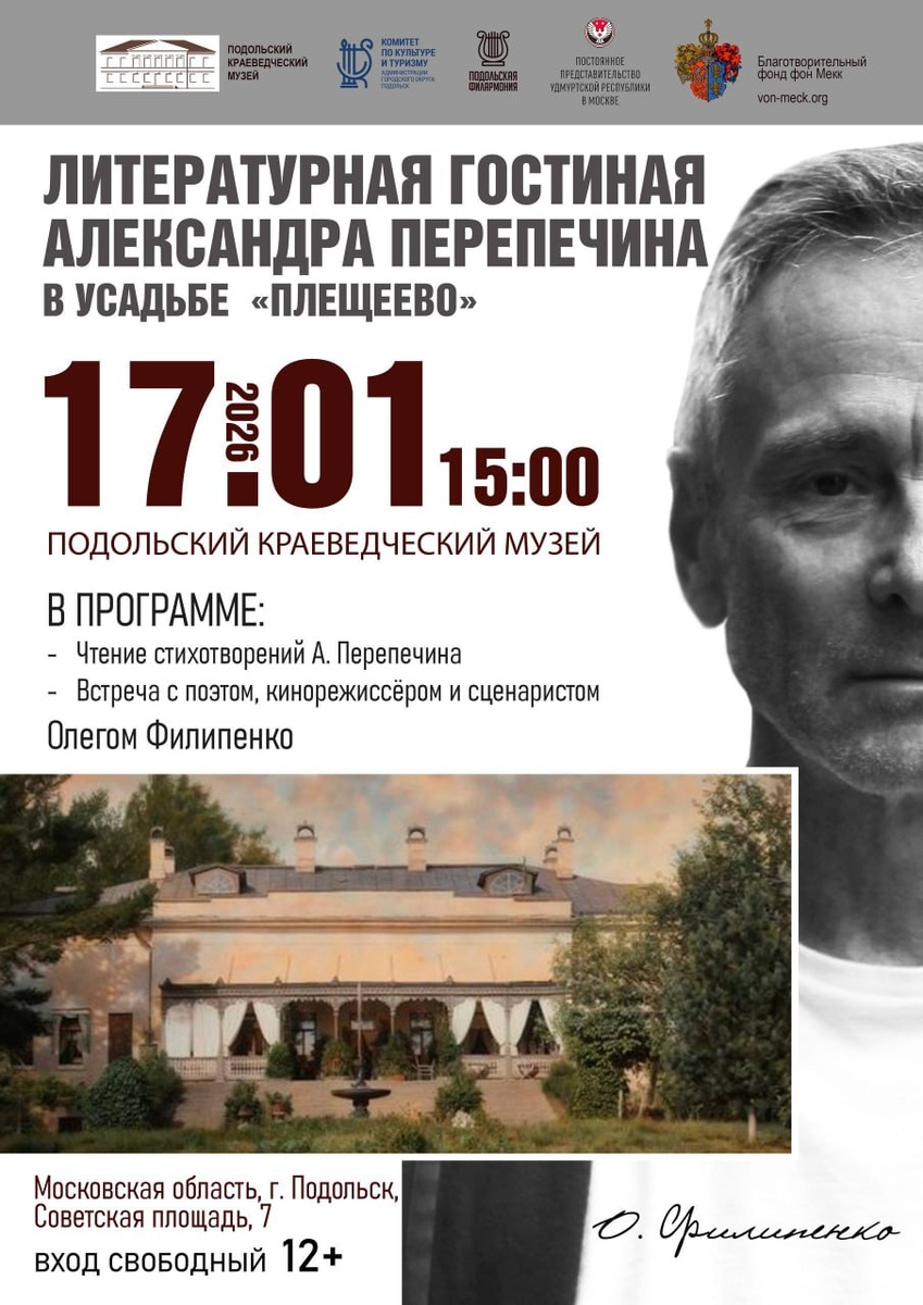 📚 В программе : 👉чтение стихотворений Александра Перепечина 👉 встреча с поэтом, кинорежиссёром и сценаристом Олегом Филипенко. 🚫 Возраст: 12+ 📆 17.01.2026 🕒 15:00 🏢 Подольский краеведческий музей 📍 г. Подольск, Советская площадь, д.7 💰 Вход свободный❗️ ⭐Поддержать канал голосом 🍰Где поесть в Подольске ✅ Мероприятия Подольск https://dzen.ru/id/66ed500f7b5671493eca3fd6 http://vk.com/podolsk_events http://dzen.ru/podolsk_events