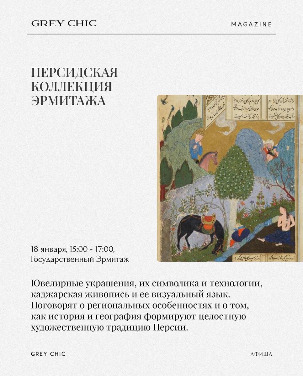 🔖Персидская коллекция Эрмитажа Экскурсия, посвящённая персидскому искусству: ювелирные украшения, их символика и технологии, каджарская живопись и её визуальный язык. Поговорят о региональных особенностях и о том, как история и география формируют целостную художественную традицию Персии. Подробности 🟢18 января, 15:00 - 17:00 📍Государственный Эрмитаж, Дворцовая площадь, Санкт-Петербург 🔖Фильм «Марти великолепный» Спортивная драма без правил и жанровых ограничений. 1952 год, настольный теннис, Америка, одержимость победой — и путь героя, в котором больше соблазнов, падений и абсурда, чем спорта. Тимоти Шаламе, Гвинет Пэлтроу, Tyler, the Creator, Абель Феррара и даже закадровый Роберт Паттинсон. Для тех, кто любит кино как метафору человеческих амбиций. 🟢Ищите в кинотеатрах Санкт-Петербурга 🔖«Открытый мир. Современное искусство Ростовской области» Музей Фаберже представляет масштабную экспозицию в рамках проекта «Открытый мир». Более 180 работ: живопись, графика, скульптура,