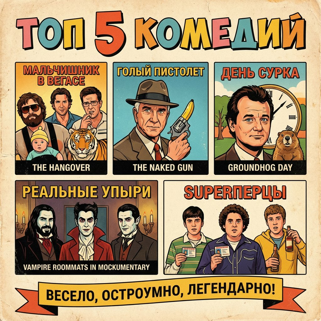 Смех продлевает жизнь, а хороший фильм — это лучший способ снять стресс после тяжелой рабочей недели. В мире кино тысячи комедий, но есть те, которые стали эталонами жанра. В этой статье мы собрали 5 кинокартин, которые гарантированно поднимут вам настроение. Это фильмы разных поджанров: от классического абсурда до современных мокьюментари. Если вы ищете определение слова «безумие», то этот фильм — идеальный кандидат. Сюжет завязывается вокруг четырех друзей, которые отправляются в Лас-Вегас на мальчишник. Проснувшись на следующее утро, они обнаруживают в ванной тигра, в шкафу — младенца, а у одного из героев не хватает зуба. Главная проблема — жених исчез, а никто не помнит, что произошло ночью. Весь фильм — это детективное расследование собственного беспамятства. Юмор строится на абсурдных ситуациях и химии между персонажами, особенно выделяется Зак Галифианакис в роли странноватого Алана. Интересный факт: Зуб, которого не хватает у персонажа Эда Хелмса, — настоящий пробел. У актер