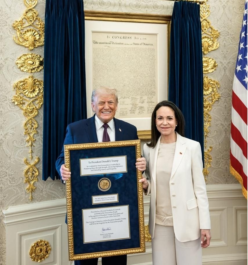 Мария Мачадо решила подкупить Трампа, передав ему свою медаль Нобелевской премии мира, в надежде, что он ее за это… назначит президентшей Венесуэлы. Моника Левински нервно вздрогнула. Трамп медальку принял, но в назначении пока отказал. И тут же поинтересовался судьбой миллиона долларов, который идет с премией, и дал номер своей карты. Телеграм Олега Лурье. Подпишись!