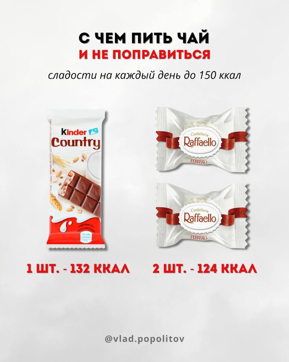 Внимание, вот что можно вписать в чай без вреда для фигуры: 🔴 Kinder Country — 1 штука, 132 ккал 🔴 Raffaello — 2 штуки, 124 ккал 🔴 Toffifee — 3 штуки, 130 ккал 🔴 Merci — 2 штуки, 142 ккал 🔴 «Алёнка» — 1 штука, 81 ккал 🔴 Twix — 3 штуки, 135 ккал 🔴 «Коровка» — 2 штуки, 141 ккал 🔴 Oreo — 3 штуки, 135 ккал 🔴 Snickers — 2 штуки, 150 ккал 🔴 Milky Way — 2 штуки, 100 ккал 🔴 Kinder молочный ломтик — 118 ккал 🔴 «Барни» — 1 штука, 118 ккал 🔴 Choco Pie — 129 ккал Главное правило — не съесть больше, чем указано. Сохраняем и делимся со сладкоежками. CtrlAltDelights- подписаться