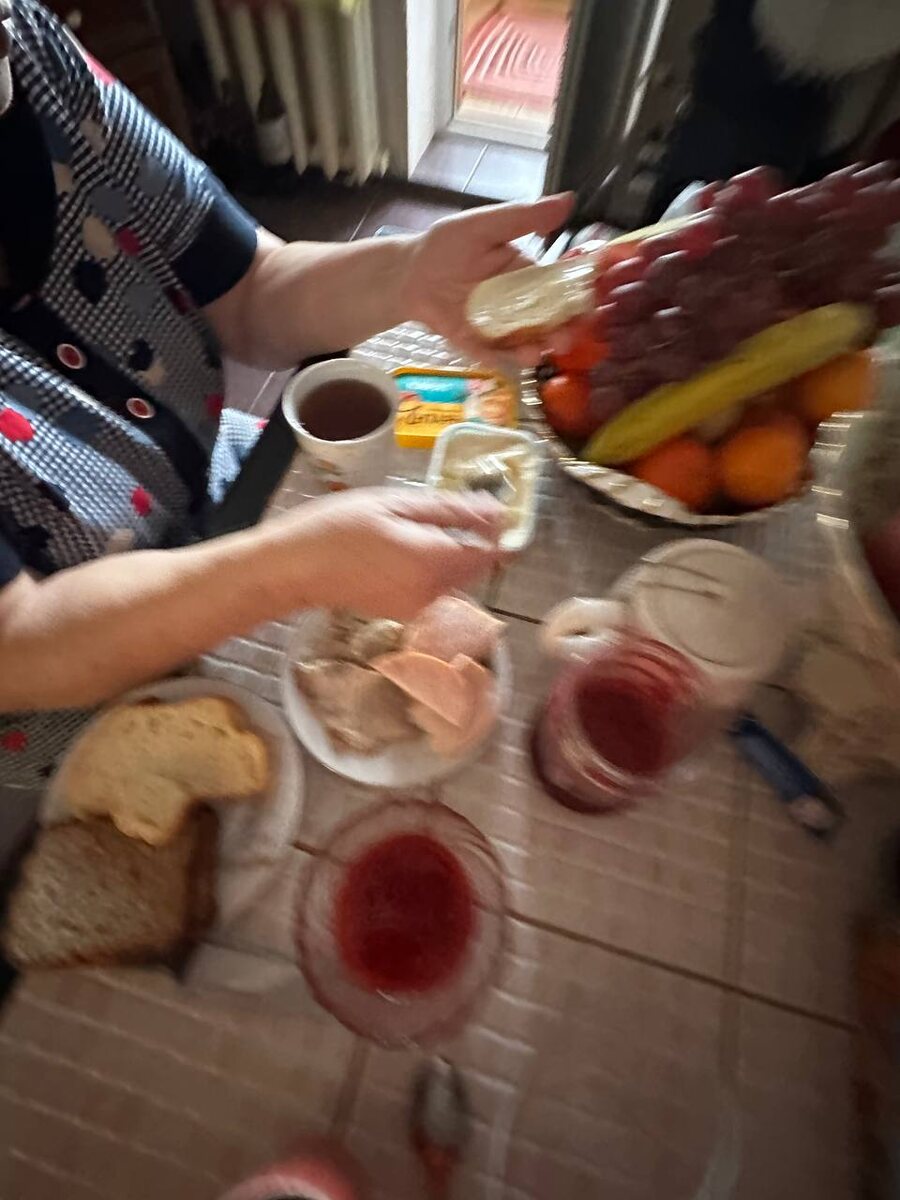 мастер фотографий) заходила к сониной бабушке, она меня напоила чаем с протертой земляникой, накормила бутерами и подарила огромную корзину с фруктами 🧡