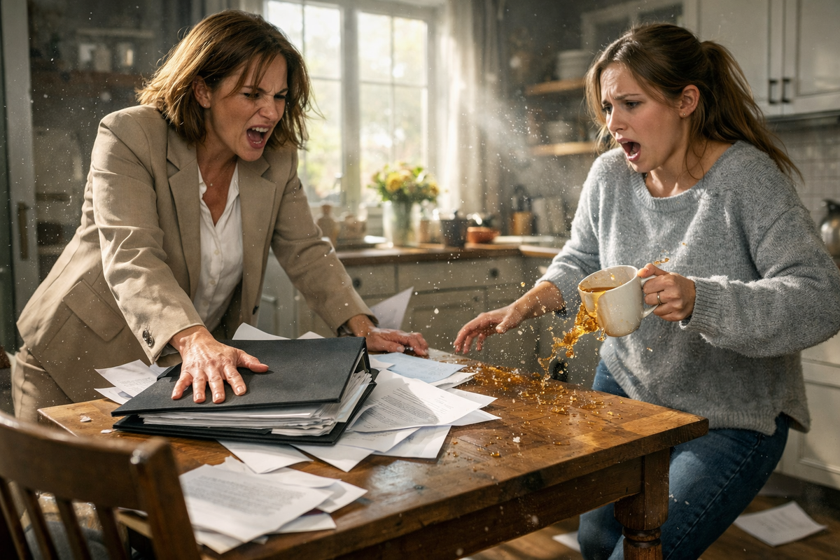 Я стояла на кухне, когда сестра Ольга вошла с папкой документов. Лицо жёсткое, губы сжаты.