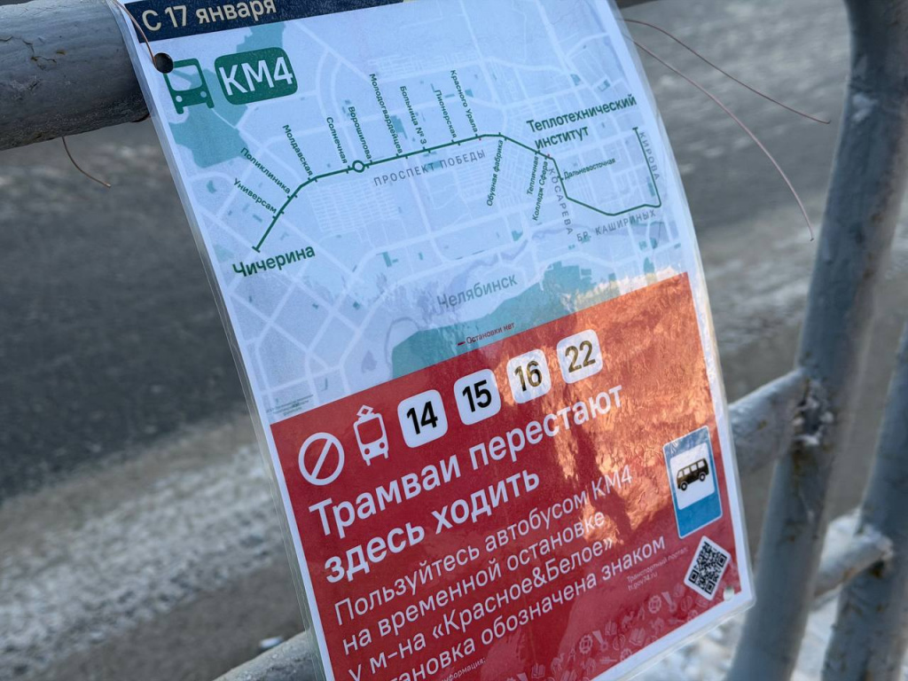 Транспорт будет останавливаться там на время, пока закрыто движение трамваев от улицы Чичерина до перекрестка с улицей Калинина. В министерстве дорожного хозяйства и транспорта Челябинской области напомнили, что сегодня вечером, 16 января, на участке проспекта Победы в рамках реализации проекта метротрама будут вести работы по присоединению временных путей. Поэтому с 22:00 сегодня и до 23:00 26 января вагоны с Северо-запад и на Северо-запад курсировать не будут. «Для пассажиров организован компенсационный автобусный маршрут по проспекту Победы, улицам Косарева, Братьев Кашириных и Кирова. На линии работают 10 автобусов большого класса с интервалом 10–20 минут», – сообщили в ведомстве. Для того, чтобы спецавтобус КМ4 мог высаживать и забирать пассажиров в соответствии со всеми требованиями безопасности, на проспекте Победы организовали временные остановки. Компенсационный маршрут начнет работу завтра, 17 января. Схема размещена ниже.