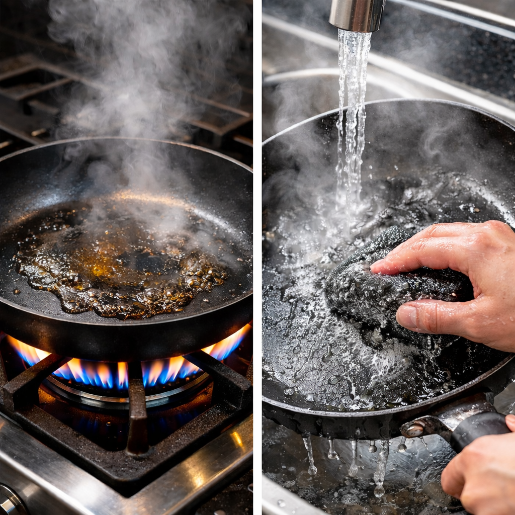 У тебя отличная сковорода (например WMF) с антипригарным покрытием, но она почему-то теряет свойства быстрее, чем хотелось бы? Часто дело не в качестве посуды, а в мелких ошибках, которые мы допускаем каждый день. Вот самые распространённые - и как их легко исправить: 1. Сильный огонь без необходимости Многие ставят посуду «на максимум» и думают, что так еда приготовится быстрее. На деле сильный огонь разрушает антипригарный слой, делает его менее гладким, а масло и остатки пищи начинают пригорать. На таких температурах покрытие теряет свои свойства, а готовка превращается в пытку. Готовь на среднем или умеренном огне - твоя посуда скажет тебе «спасибо». 2. Резкое охлаждение после готовки Ты только что снял сковороду с плиты и сразу же подставил под холодную воду? Термический шок - одна из главных причин деформации и повреждения покрытия. Из-за резкого перепада температур материал сжимается неравномерно, появляются микротрещины. Дай посуде остыть хотя бы 10-15 минут, прежде чем мыть. 3