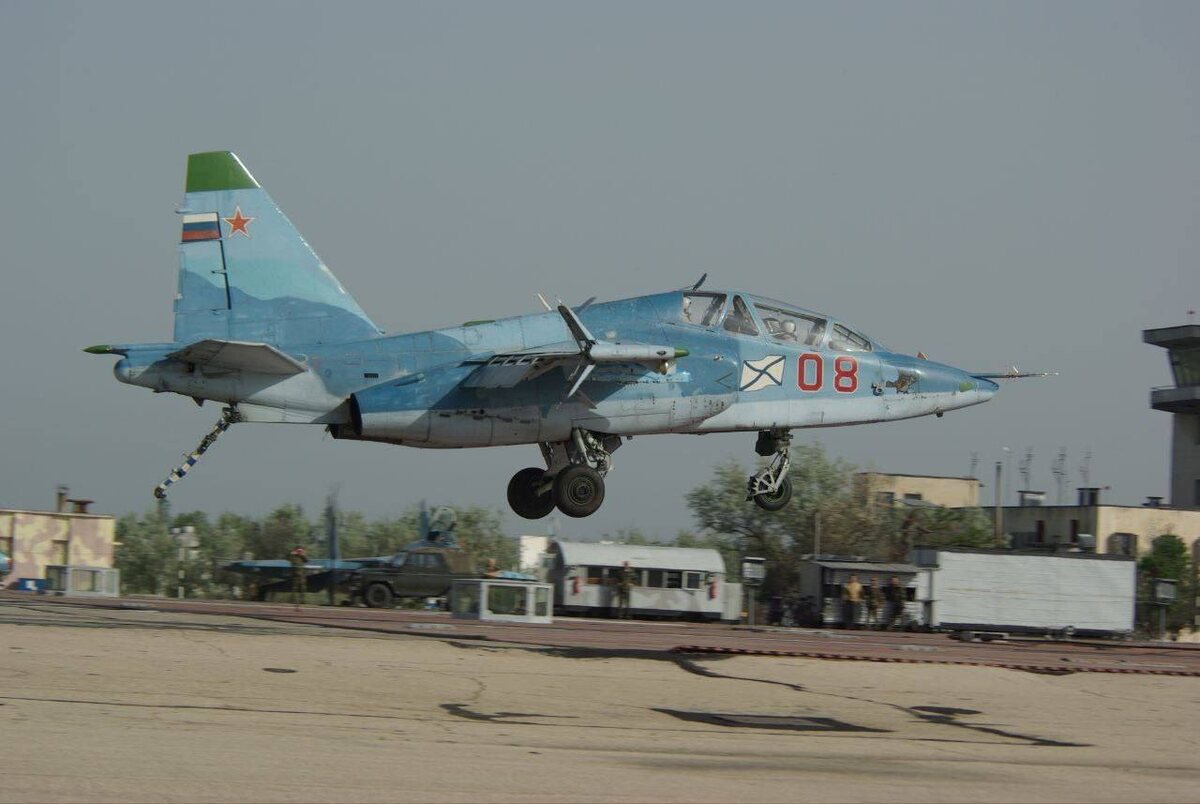 Один из двух корабельных учебно-тренировочных самолетов Су-25УТГ выполняет посадку на посадочный блок с аэрофинишёрами комплекса «Нитка».