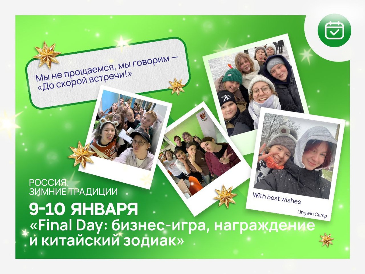 » 🎅 Заключительные дни смены — это всегда максимум событий и эмоций. 9 января ребята увидели расписание так, как его видят вожатые и педагоги — полностью на английском: Wake up, Assembly, Lessons, Films, Podcast, Walk, Business game, Galla concert, Candle time. К финалу смены такие слова уже были естественной частью их активного словаря. 🎄 Днём прошла динамичная бизнес‑игра с аукционом: дети зарабатывали условные «валюты» своей активностью, знаниями и участием в жизни лагеря, а затем «покупали» лоты — от символических сувениров до особых прав и возможностей в отряде. 🎁 Важной частью дня стало награждение ребят в номинациях: ❄️ Best Camper — за включённость в лагерь и поддержку других, ❄️ Best Student — за настойчивость и успехи в английском, ❄️ Best Speaker — за смелость и уверенность в общении, ❄️ Camp Activities Hero — за активное участие в мероприятиях и креатив. Ⓜ️Ⓜ️Ⓜ️Ⓜ️Ⓜ️Ⓜ️Ⓜ️Ⓜ️Ⓜ️Ⓜ️ Вечером состоялось торжественное закрытие смены Lingwin и тёплый Galla concert. Благодар