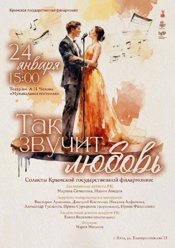 » Любовь и музыка — два чуда в нашей жизни. Наверное, ничто не вызывает таких сильных переживаний у нас, как настоящая любовь и хорошая музыка. Для кого-то любовь стала музыкой сердца и души, для кого-то музыка стала настоящей любовью. В программе прозвучат произведения выдающихся русских и зарубежных композиторов: П. Чайковского, С. Рахманинова, Э. Капуа, Н. Рота, А. Пьяццолла и др. 👉 Когда? 24 января в 15:00 👉 Где? Г. Ялта, театр имени А.П. Чехова , ул. Екатерининская 13 👉 Билеты на события приобретайте следующими способами — на сайте kassa24.ru (оплата платежными картами) ✨Давай сходим | Крым