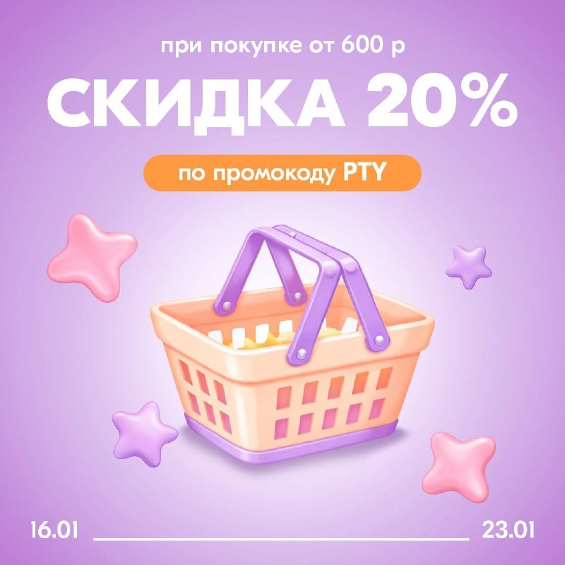 ! Набирайте корзину на 600 и более рублей, называйте промокод на кассе — скидка ваша! Акция действует с 16 января по 23 января включительно! Вперёд за выгодными скидками!