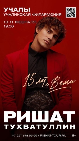 (6+) У нас в гостях Ришат Тухватуллин «15 лет вместе» — новая концертная программа Ришата Тухватуллина — выдающегося певца, чье имя стало символом музыкальной культуры двух республик. Нач. 19:00 Билеты в продаже в кассе филармонии и онлайн по ссылкам: 10.02 — clck.ru/3QmTFm 11.02 — clck.ru/3QmTFn Действует Пушкинская карта Касса работает в будние дни с 10:00 до 19:00 перерыв 14:00 — 15:00 Источник https://uchaly102.ru/?p=120516