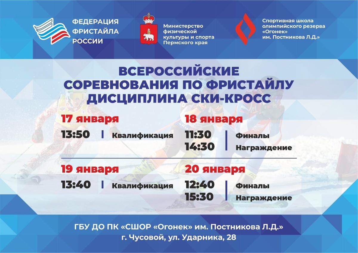 Постникова Л.Д." пройдут Всероссийские 🇷🇺 соревнования по фристайлу в дисциплине ски-кросс🎿🎿🎿 На старт выйдет более 100 спортсменов из 11 регионов. Мы станем свидетелями увлекательного зрелища, захватывающей борьбы и драйва! Программа соревнований: 17 января (квалификация) - начало 13-50 18 января (финалы) - начало 11-30 18 января (церемония награждения) - 14-40 19 января (квалификация) - начало 13-40 20 января (финалы) - 12-40 20 января (церемония награждения) - 15-30 Поддержим наших спортсменов💪🤞🫶 #Огонек #фристайл #скикросс #Чусовой