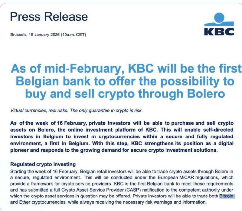 🇧🇪 Второй по величине бельгийский банк, KBC, планирует предоставить своим клиентам услугу торговли BTC.