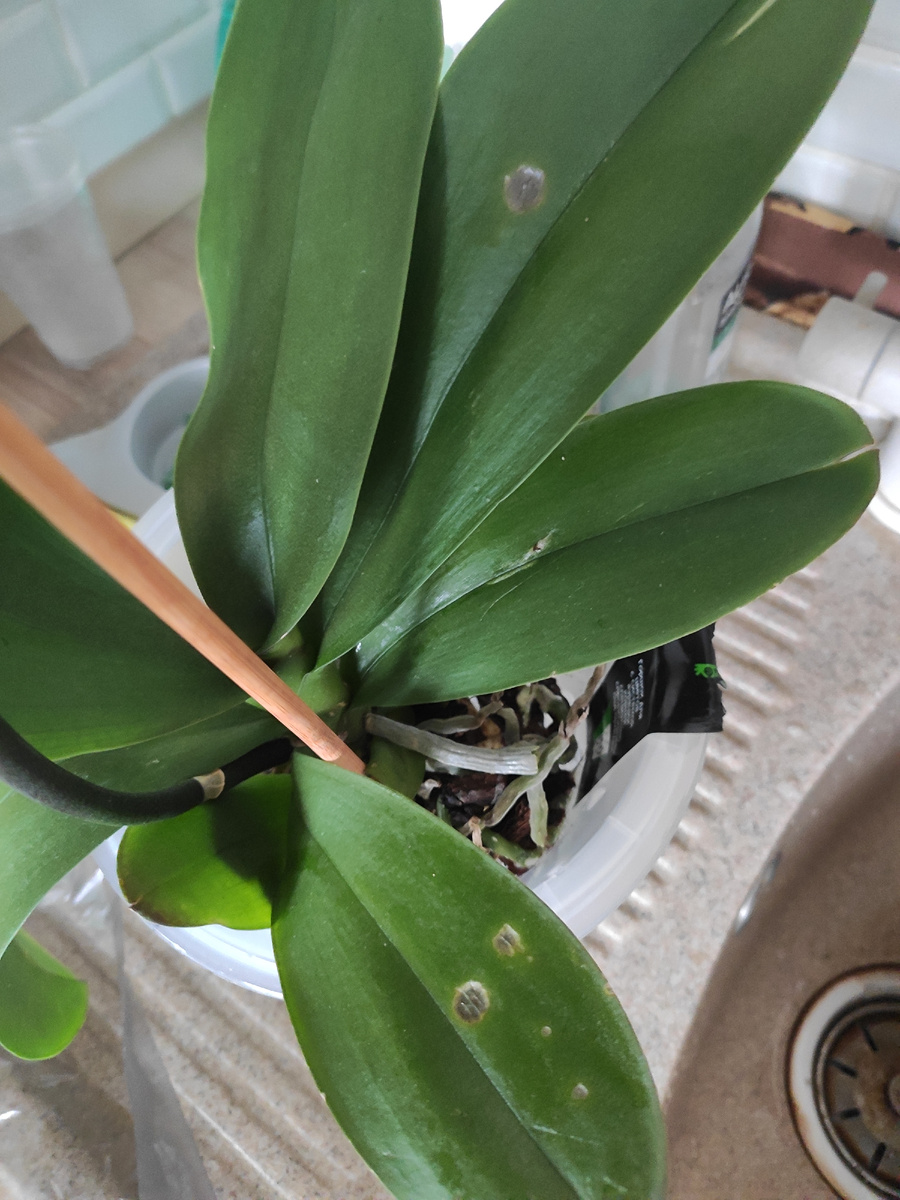 По невнимательности я приобрела орхидею с признаками болезни. Только дома на листьях увидела два темных пятна. За неделю появилось третье.