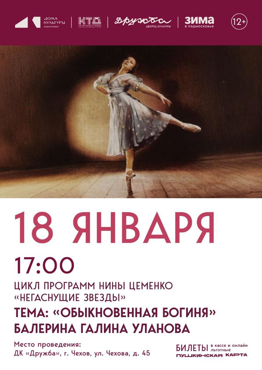 ✨ У кого Пушкинская карта!? Можно сходить по ней на мероприятие! 📜Авторская программа Нины Цеменко «Негаснущие звезды» посвящена балерине Галине Улановой. Имя Улановой – это целая эпоха в мире балета. 🩰Ее танец вдохновлял миллионы зрителей, а сама Галина Сергеевна была названа Алексеем Толстым «Обыкновенной богиней». ❗ Встреча позволит вам погрузиться в мир искусства и узнать больше о жизни и творчестве этой выдающейся личности. 🚫 Возраст: 12+ 📆 18.01.2026 🕛 17:00 🏢 ДК «Дружба» 📍 г. Чехов, ул. Чехова, д.45 💰 Цена: 200 ₽ 🔗 Купить билет: https://iframeab-pre11724.intickets.ru/event/69264922/#abiframe ⭐Поддержать канал голосом ✅ Мероприятия Чехов https://dzen.ru/id/66cc4b48e9ef144699238a51 http://vk.com/chekhov_events http://dzen.ru/chekhov_events