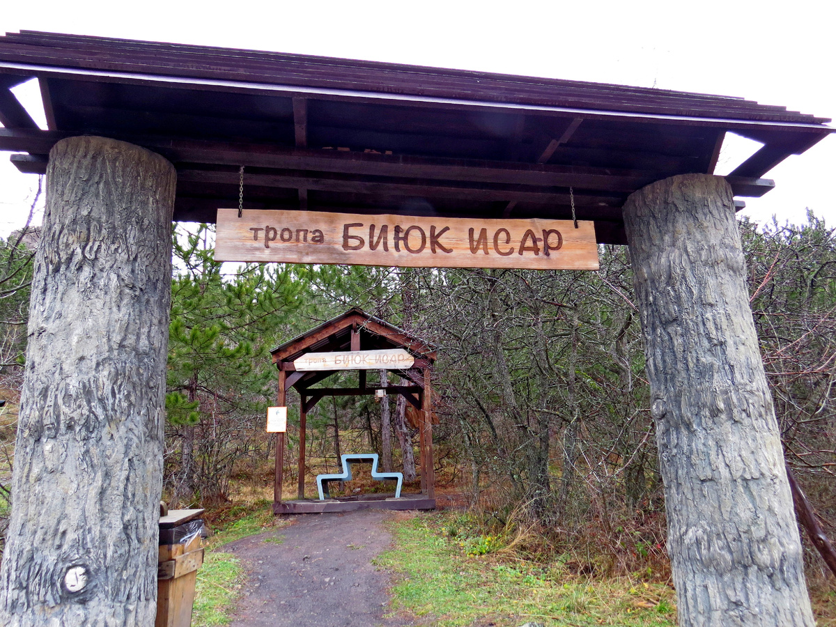 Пока мы катались и пытались фотографировать под дождём красоты, расположенные на Старой Севастопольской дороге, уже приблизилось время обеда. Совершенно неожиданно на обочине нам попался столик с навесом и надписью Тропа Биюк-Исар. Пока мы обедали, дождик прекратился и даже начало выглядывать солнышко. Домой еще рано возвращаться, так почему бы нам не пройтись хоть немного по тропе! Сама тропа ведет на плато Ай-Петри, так далеко нам пока не надо. Но мы пошли. Первая видовая площадка просто поразила нас! Именно открывающимися видами! Еще солнце помогло слегка осветив отдельные скалы. Должна сказать, что дальше уже можно и не ходить! Таких видов больше не будет! Можно просто усесться на скамеечку и смотреть, как рождаются готические замки из скальных обрывов Ай-Петри. А те, что уже подросли, просто отделяются и идут вперёд. Сказка! Дальше было 2 озера и дорога по крутому склону к скале Биюк-Исар. Места красивые, деревья большие, но уже видов таких нет. Пока это была просто ознакомитель