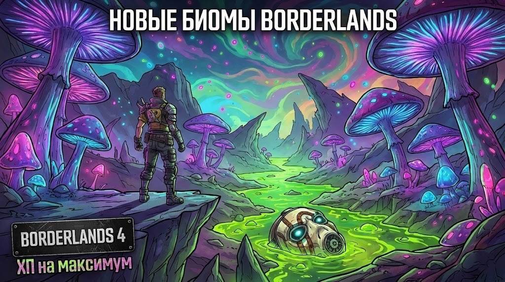Привет, искатели Хранилища и любители сочного лута! Приготовьте свои щиты и проверьте запасы патронов, потому что Пандора официально остается в зеркале заднего вида. На календаре 15 января 2026 года, и студия Gearbox решила подлить масла в огонь нашего любопытства, опубликовав первые официальные концепт-арты новых миров из грядущей Borderlands 4. Если вы думали, что видели в этой вселенной всё, то новые пейзажи заставят вас пересмотреть свои взгляды на инопланетную флору и фауну. 🌵 Самое яркое впечатление оставляют изображения планет с колоссальными грибными лесами. Это не просто декорации, а целые экосистемы, где огромные светящиеся грибы заменяют деревья, а споры в воздухе создают неповторимую, почти психоделическую атмосферу. На артах видно, как лучи чужого солнца пробиваются сквозь шляпки-гиганты, окрашивая всё вокруг в неоновые оттенки фиолетового и бирюзового. Визуальный стиль Borderlands 4 явно стал более детализированным и «сочным», при этом сохраняя тот самый фирменный сел-ше
