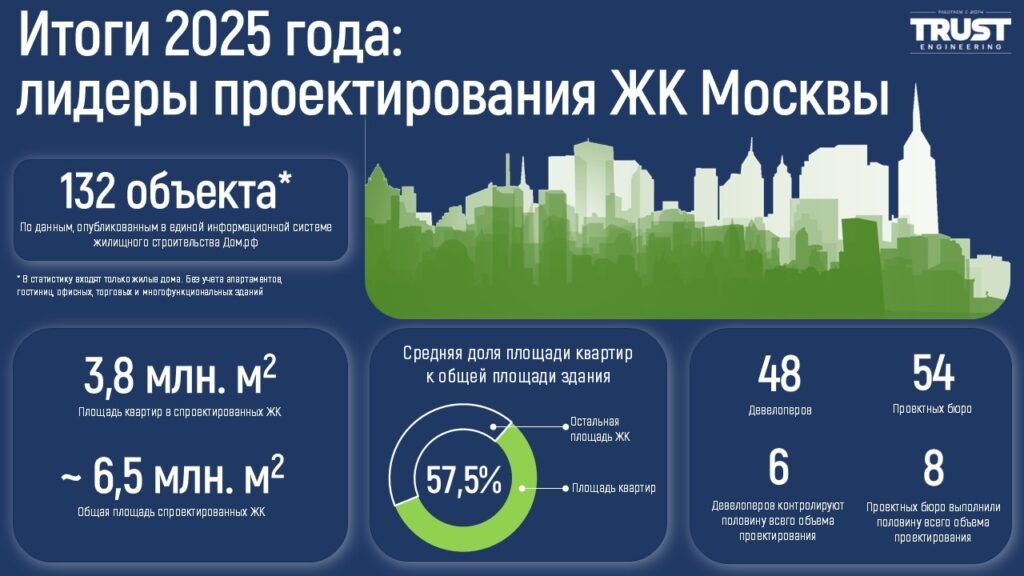Продолжаем подводить итоги года. На этот раз мы изучили базу данных Дом.рф и составили список лидеров проектного рынка жилых комплексов Москвы за прошедший, 2025 год. Статистика собрана по новостройкам Москвы, которые внесены в базу Единой информационной системы жилищного строительства Дом.РФ в 2025 году. В нашей инфографике приведены данные только по жилым комплексам - без учета гостиниц, офисов, торговых центров и другой недвижимости. Всего в базу в 2025 году были внесены 132 ЖК. Кстати говоря, количество проектов за последние пять лет, к сожалению, неуклонно снижается: с 214 объектов в 2021 году до 132 в 2025 году (см. ниже). Общая площадь квартир в этих 132 ЖК - 3,8 млн. кв.м. В эту площадь не входят другие площади объекта (кроме самих квартир) - паркинг, арендные помещения, лестницы, холлы, технические помещения и т.п. Если их учесть, то общая площадь этих ЖК составит примерно 6,5 млн. кв.м. Эти объекты реализовываются 48 девелоперами, а проекты выполнили 54 компании. При этом 6 к