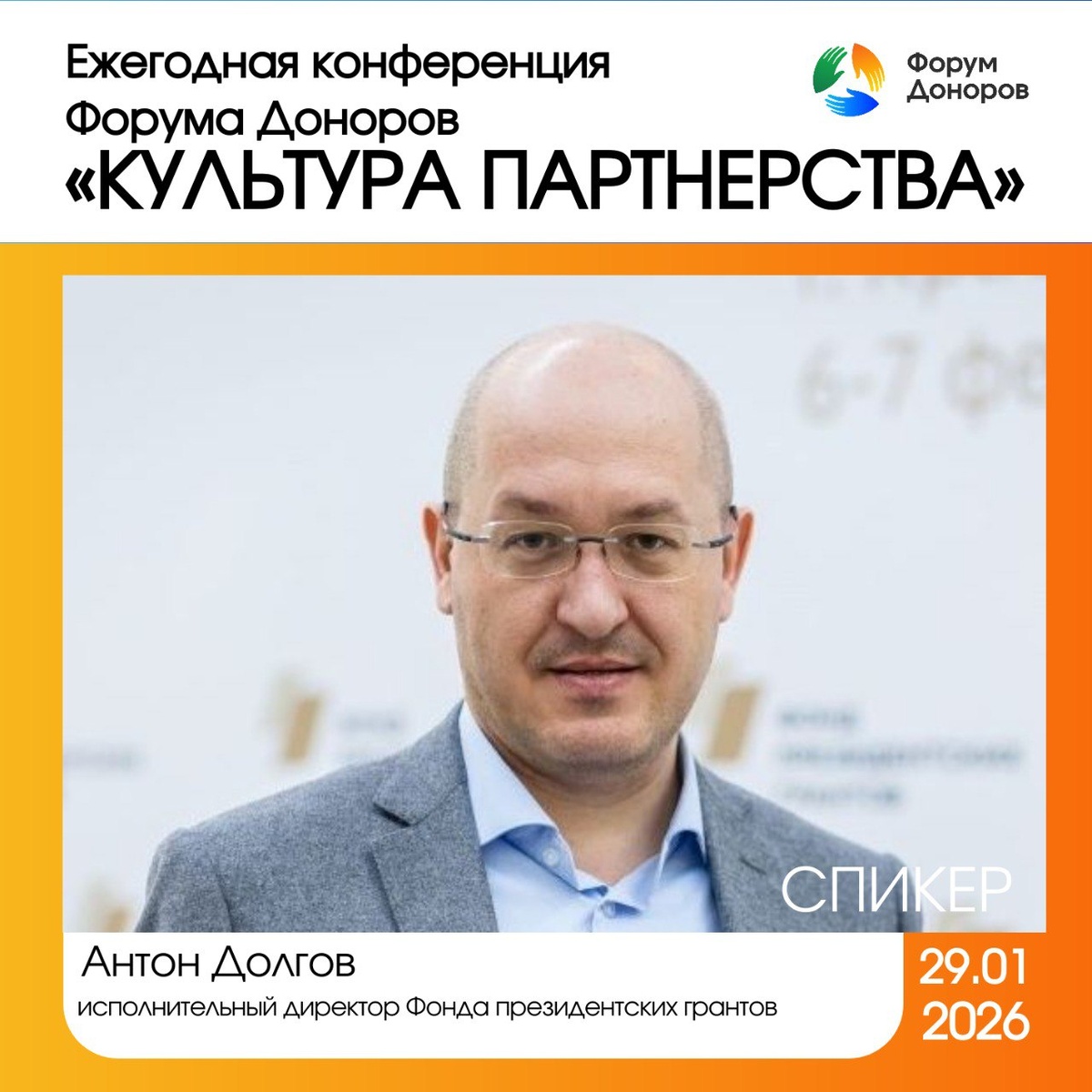 Состав спикеров Ежегодной конференции Форума Доноров - 2026, посвященной в этом году теме "Культура партнерства", почти готов, и мы начинаем его обнародовать! Исполнительный директор @presidentialgrants Антон Долгов - спикер пленарной сессии. Можно и нужно приходить в зал. На наших дискуссиях работает свободный микрофон, а кроме того все наши события ценны нетворкингом и знакомством с единомышленниками. Вход бесплатный, по регистрации. 29 января, Москва, Центр "Благосфера". Весь день. Регистрация и подробности Форум Доноров. Объединяем лидеров благотворительной деятельности и корпоративной социальной ответственности