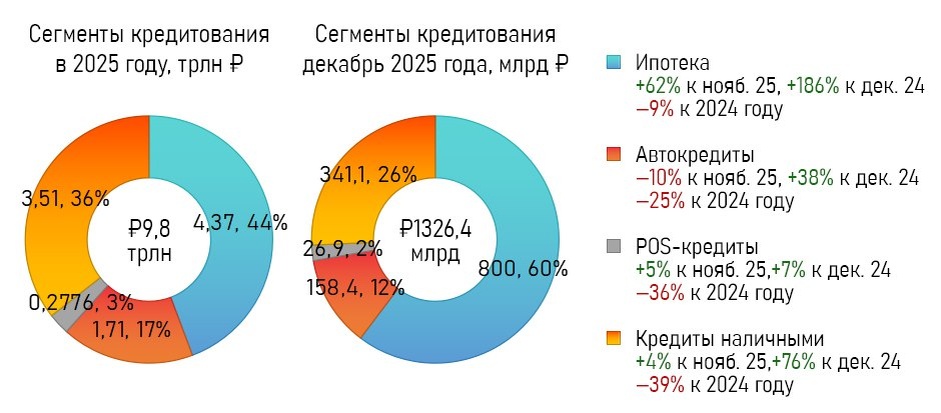 В декабре 2025 года банки выдали физлицам ₽1,32 трлн кредитов. Это на 29,4% больше, чем в ноябре, и более чем в 2 раза (+115,9%) выше уровня декабря 2024. При этом за весь 2025 год объём кредитов составил ₽9,88 трлн, что на 25,4% меньше, чем в 2024 году. Ипотека • Декабрь: рекордные ₽800 млрд (+61,6% к ноябрю, +185,6% к декабрю 2024). • Год: ₽4,37 трлн (−8,9% к 2024 году). Автокредиты • Декабрь: ₽158,4 млрд рублей (−10,2% к ноябрю), снизились средний чек и количество сделок. • Год: ₽1,71 трлн (−25% к 2024 году). POS-кредиты (покупки в магазинах) • Декабрь: ₽26,9 млрд (+5% к ноябрю), средний чек вырос до ₽74,4 тыс. (+4,1% к ноябрю). • Год: ₽277,6 млрд (−36,1% к 2024 году). Кредиты наличными • Декабрь: ₽341,1 млрд, средняя сумма выросла до ₽191,5 тыс. (+6% к ноябрю), но общее число кредитов сократилось (−2,3% до 1,78 млн). • Год: ₽3,51 трлн (−38,6% к 2024 году). По итогам 2025 года лучше всего себя показала ипотека. Интересно, был бы такой бум в декабре (~88% сделок оформлены