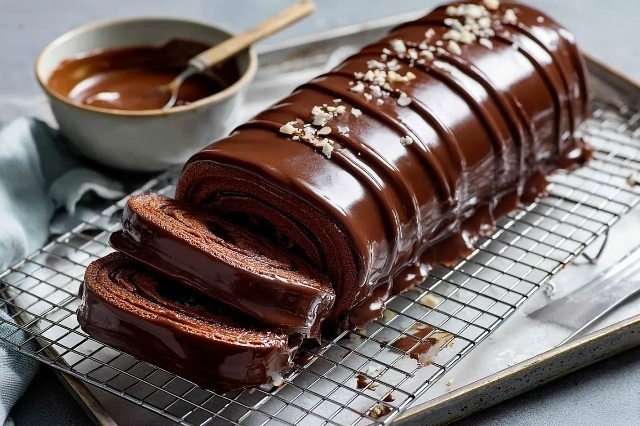 На водяной бане растопите 200 г чёрного шоколада. При желании добавьте немного измельчённого жареного миндаля для хруста. Осторожно снимите рулет с плёнки, поставьте на решётку и полейте тёплым шоколадом, распределив по поверхности ложкой или шпателем. После остывания глазурь застынет и придаст десерту блеск и структуру.