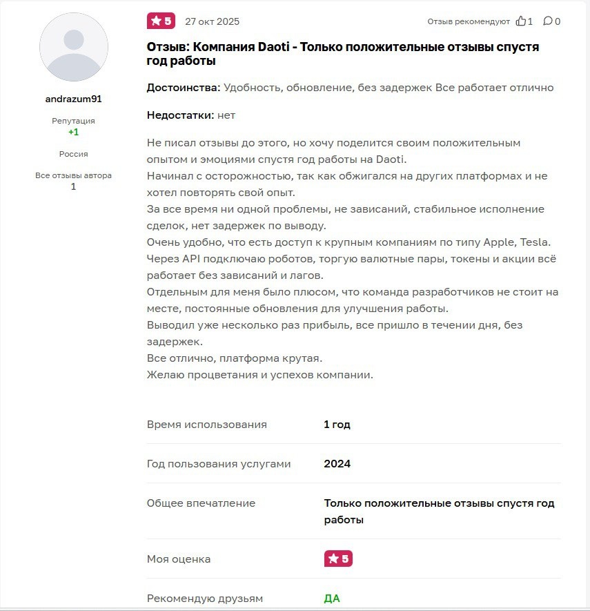 Daoti.io — торговая платформа, которая всё чаще появляется в обсуждениях трейдеров, особенно в среде алготрейдинга. Пользователи отмечают стабильность, быстрый вывод средств, удобный API и доступ к криптовалютам и акциям США в одном интерфейсе. В этой статье собраны реальные отзывы о Daoti.io, основанные на опыте трейдеров с разным подходом к торговле. Отзыв №1. Год торговли без проблем Один из пользователей делится опытом годовой работы на Daoti.io. Он отмечает, что начинал с осторожностью, но за всё время не столкнулся ни с зависаниями, ни с проблемами при выводе средств. Сделки исполняются быстро, платформа работает стабильно как при ручной торговле, так и через API. Также пользователь подчёркивает удобство доступа к акциям США — Apple, Tesla, — в одном кабинете вместе с криптовалютами. Отзыв №2. Удобная платформа для криптотрейдинга Трейдер, работающий в основном с криптовалютами, отмечает узкие спреды и мгновенное исполнение сделок. По его словам, Daoti.io подходит для активной т