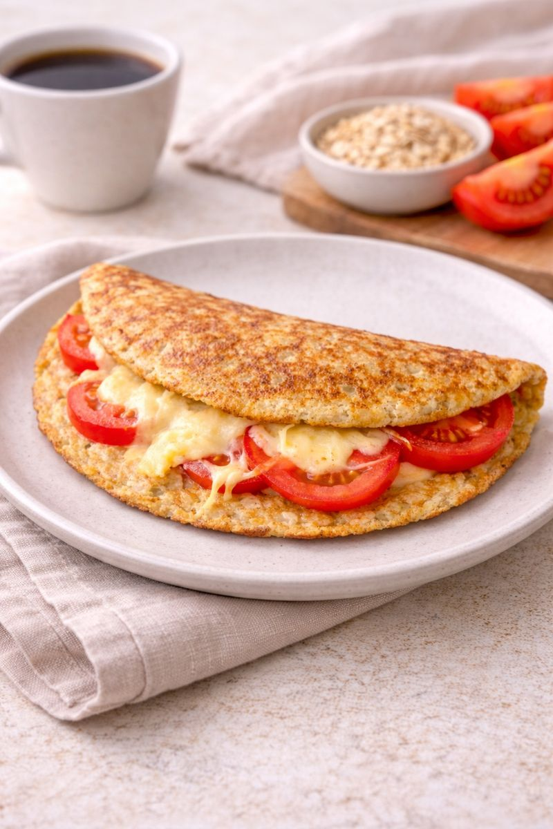 Накрываю крышкой — и через пару минут всё готово. Когда сыр расплавился — можно есть. Румяный овсяноблин, тянущийся сыр, сочные помидоры.