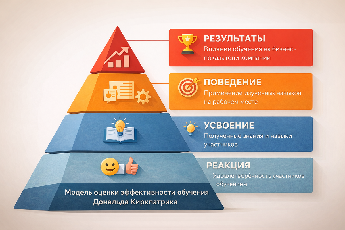Статья из цикла "Практика бизнес-консультирования". Чтобы показать, как работает модель Киркпатрика на практике, приведу реальный кейс внедрения управленческого обучения в производственной компании. В этом кейсе мы рассматриваем именно обучение мастеров участков и начальников смен. Собрали запрос с руководителя производства и других смежных руководителяей: Ключевые бизнес-показатели для улучшения: Вывод: обучение должно прямо влиять на эти показатели через изменения в поведении мастеров участков и начальников смен. Мы анализируем, какие действия руководителей напрямую влияют на результаты: Для каждого действия сформированы конкретные алгоритмы и техники работы. И тренинг направлен на обучение именно этим алгоритмам и техникам! Теперь формируем целевой набор знаний и навыков, который руководители получат на обучении: Эти знания закреплялись через практику на реальных кейсах компании. Длительность: 6 недель (сочетание очных тренингов и онлайн-супервизий). Формат: Поддержка между модулями