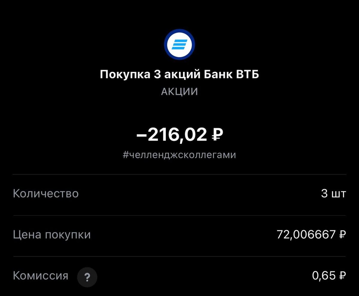 ! Покупка на сегодня #348 Статистика портфеля на стороннем сервисе, можно посмотреть по "ссылке" Напомню это челлендж с коллегами, каждый рабочий день пополняем брокерский счет на 250 рублей и инвестируем. Если возникли вопросы или есть не понимание, что делать. Задавайте «тут» Покупка #348 🟢 «ВТБ» 71.11 rub #VTBR 3 лота #каждыйсможет #челенджсколлегами ✈️ Стас Мироненко