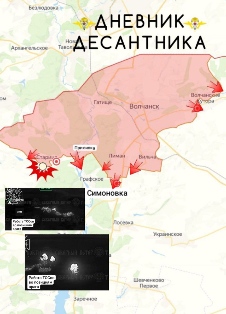 Докладывает Добрый🫡 Не прекращаются ожесточенные бои. Подразделения ВС РФ продвигаются при поддержке ВКС РФ, артиллерии и расчетов ударных БПЛА. Противник оказывает ожесточенное сопротивление. 🔥 В районе н.п. Терновая Харьковской области разведка 11 АК ГВ "Север" обнаружили транспорт ВСУ. Ударами FPV-дронов был уничтожен пикап противника, после чего был ликвидирован и сам водитель, который успел покинуть транспортное средство, но тоже получил порцию взрывчатки. (видео) ▫️ В районе населенного пункта Старица в лесах ежедневно уничтожаются позиции противника силами артиллерии и ТОСов, чем поддерживают продвижение наших штурмовых групп. А ещё ударами российской авиации также поражены позиции врага. От населенного пункта Прилипка наши бойцы продвигаются к населенному пункту Графское, зацепившись за застройку. В населенном пункте Волчанские Хутора продолжаются тяжелые бои, в ходе которых ВС РФ контролируют уже более половины села. Также в населенном пункте работает наша тяжёлая арти