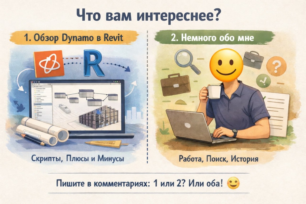 🌱 Что вам сейчас было бы интереснее на следующей онлайн трансляции?: 1️⃣ Обзор Dinamo в Revit — как это выглядит на практике, для чего используют, плюсы/минусы, сравнение с Grasshopper или 2️⃣ Немного обо мне — кто я, чем занимаюсь (честно, без глянца) Напишите в комментариях 1 или 2, или если хочется — оба варианта 😊 Буду ориентироваться на ваш интерес.