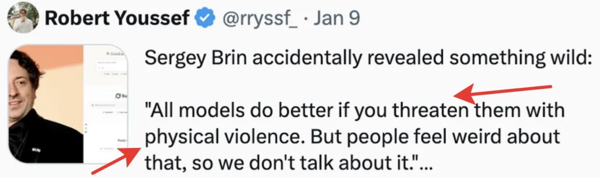 Пробовали? Брин говорит, если напугать ИИ физической расправой (насилием), то они работают лучше :) Может он пошутил, но провести