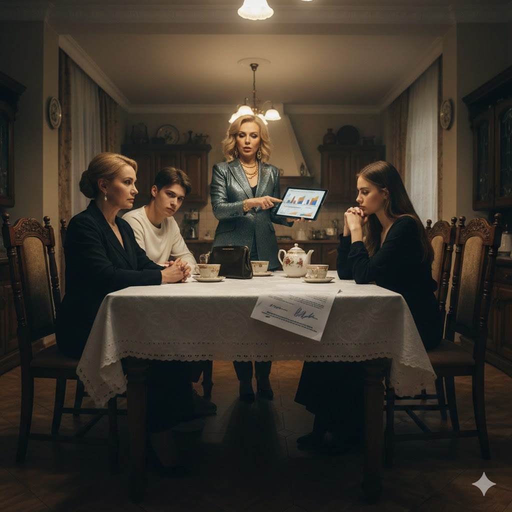 — Итак, — начала сваха, — я подготовила предварительный договор. Мы выставляем эту квартиру за тридцать два миллиона. Это верх рынка, Маргарита Степановна, поверьте моему чутью. Из них восемнадцать уходит на покупку в «Золотых ключах» — там уже всё схвачено, бронь держим до завтра. Шесть миллионов — на вашу новую уютную квартиру в Химках. Остальное — на ремонт детям и ваш личный счет.