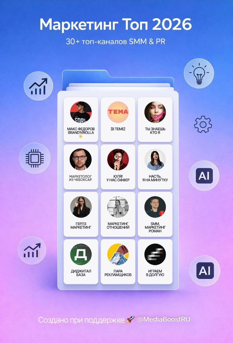 Каникулы с пользой: полезная подборка каналов Маркетинг Top 2026 — 25+ топ-каналов по SMM, Маркетингу и PR! 🚀 Представь: вместо бесконечного скролла по Telegram - один клик, и у тебя под рукой элитная подборка из 25+ каналов, где маркетологи делятся реальными мясными кейсами, ARPU-хаками, AI-трендами и инструментами для взрывного роста. Это не просто список - это структурированный арсенал для тех, кто устал на теорию и хочет внедрять прямо завтра! Твой день станет продуктивнее: уведомления только о свежем, фиды чище, идеи острее. Фрилансеры, агентчики, владельцы каналов - все в деле. Забудь хаос подписок, апгрейдни workflow и будь на шаг впереди конкурентов. 👉 Добавь папку сейчас — и почувствуй разницу! 😎