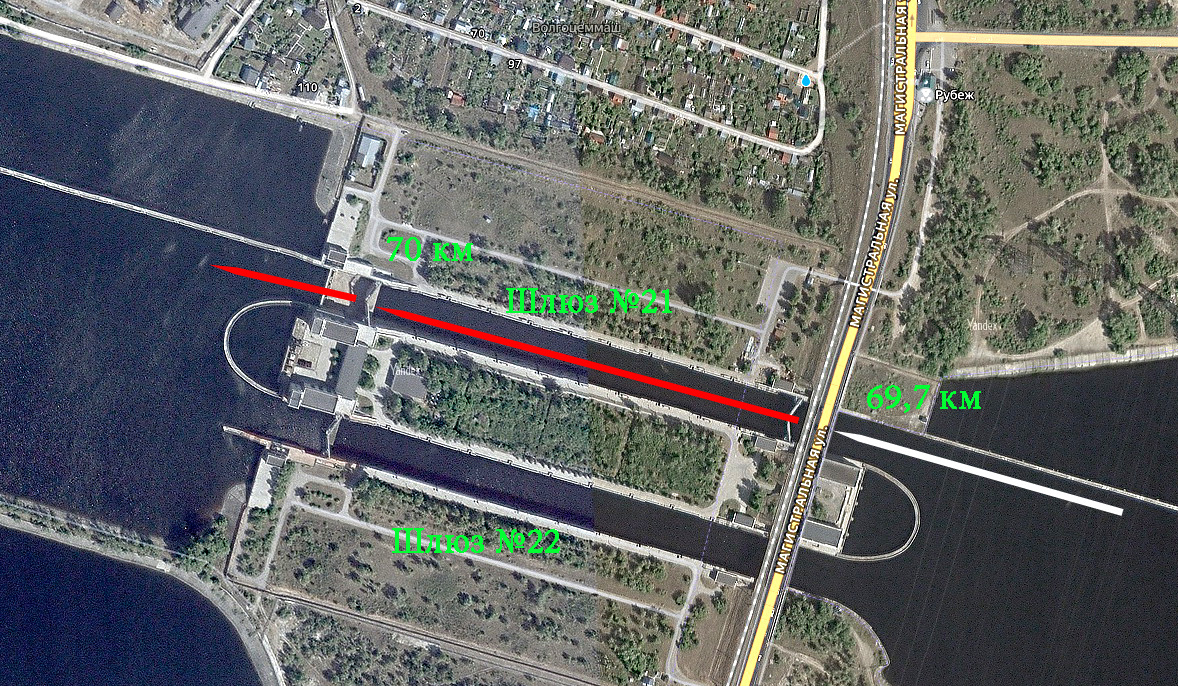 В предыдущей статье в нашем виртуальном круизе реальный теплоход «Принцесса Анабелла» подошёл к реальному шлюзу №21 Жигулёвского гидроузла. Нам предстоит подняться из межшлюзового бьефа в верхний бьеф гидроузла. Через нижнюю голову верхних шлюзов гидроузла №№21/22, водосбросную и земляную плотины, мимо здания ГЭС у правого берега проходят автомобильный и железнодорожный путепроводы, соединяющие левый и правый берега Волги. Заходим в шлюз №21. Фрагмент нижней головы шлюзов №№21/22. Проходим под пролётом моста в нижней голове шлюза. Слева в своих шкафных нишах сначала створка ремонтных ворот, чуть дальше – створка двустворчатых рабочих ворот. Вид на мостовой пролёт из камеры шлюза. В камере шлюза на уровне межшлюзового бьефа, нижние ворота ещё не закрыты, а теплоход - маневрирует. Плавучий рым – устройство для швартовки судов при шлюзовании. Во время швартовки нашего теплохода над шлюзом прошла электричка. Пока я на что-то отвлёкся, камера шлюза заполнилась до уровня верхнего бьефа гидро