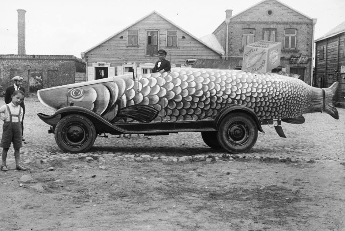 На снимке 1930-х годов из архива Wikimedia показана машина-рыба. Такой заманивали покупателей производители литовского мыла "Žuvelė", то есть «Маленькая рыбка». Вон справа на рыбе характерный кубик — как будто кусок мыла. Такая вот наживка для потребителей из XX века.