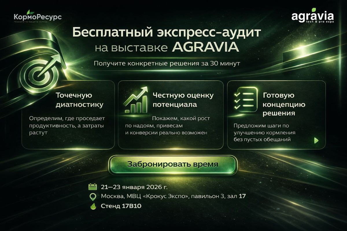Мы покажем, как её посчитать. Выставка — это десятки стендов и сотни контактов. Но реальную пользу получают те, кто приходит не за просмотром, а за решениями. На нашем стенде «КормоРесурс» (17 B10) мы не проводим экскурсии по каталогу. Мы проводим экспресс-аудит вашей ситуации с кормлением и его экономикой. 🔥 За 30 минут на стенде вы получите: ▪️ Точечную диагностику. Мы разберём вашу текущую схему кормления и найдём 1–2 ключевые точки, где продуктивность «проседает», а затраты растут. ▪️ Честную оценку потенциала. Мы определим, какой прирост по конверсии корма, надоям или привесам реально достижим с учётом ваших условий. ▪️ Готовую концепцию решения. Мы не обещаем — мы предлагаем конкретные шаги по продуктам, технологиям или протоколам, которые можно внедрить в вашем хозяйстве. 📌 Это для вас, если вы отвечаете за: • продуктивность стада/поголовья (технологи, зоотехники); • экономику производства (руководители, финансовые директора); • технологическую устойчивость (главные спе