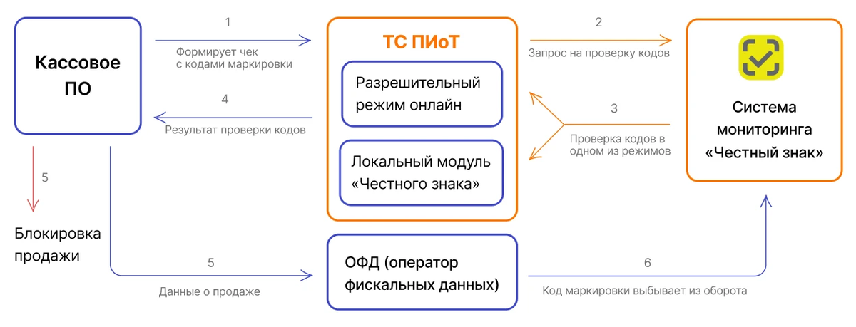 - Кассовое ПО передает код маркировки в модуль ТС ПИоТ.