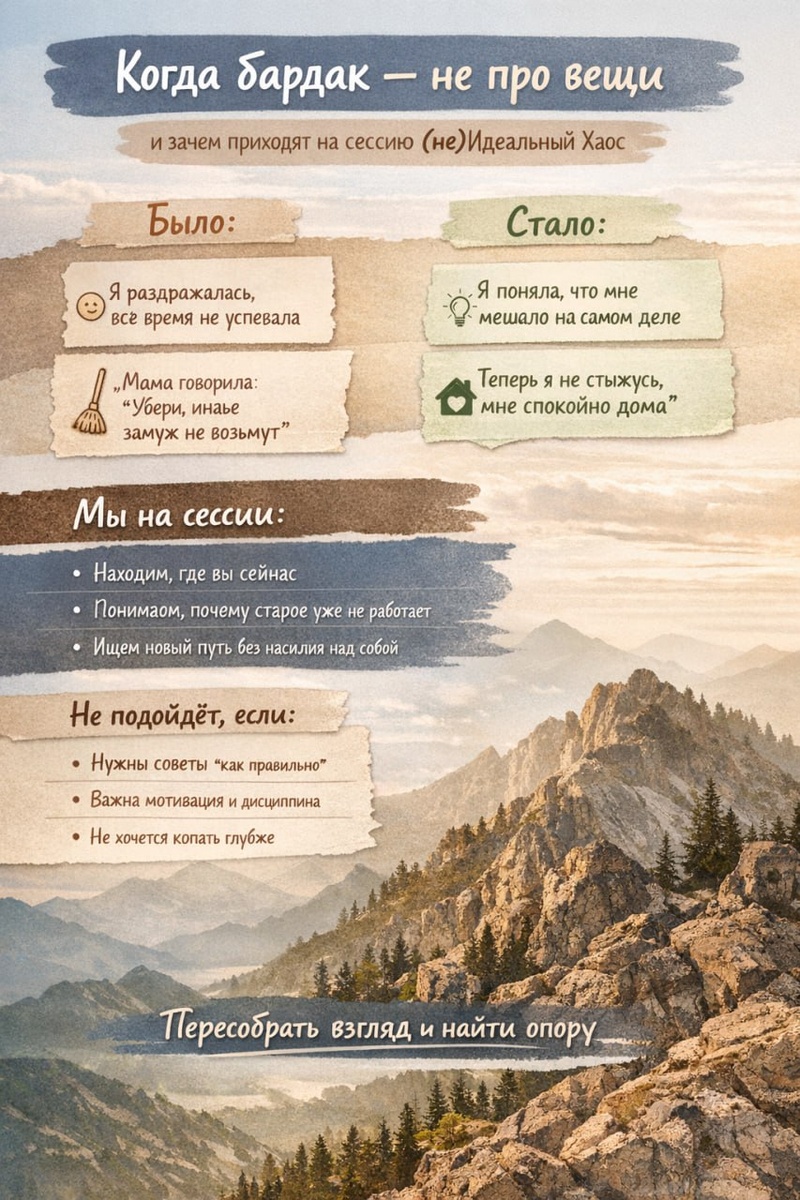 Когда бардак - не про вещи, или зачем люди приходят на сессию «(не)Идеальный Хаос» Я проанализировала результаты теста и уже проведенных стратегических сессий, и увидела одну важную вещь: люди могут приходить с разными формулировками, но почти всегда - с одним и тем же ощущением: раздражения, усталости и вопросом "Почему?! Почему я не могу взять и сделать уборку?". Ощущение, что «я так стараюсь, но не получается..». Что было до сессии - и что изменилось после Было: «Я постоянно раздражаюсь из-за бардака, который устраивают дети. Убираюсь - и сразу же всё возвращается. Кажется, что я всё время что-то не доделываю и не могу справиться ни с чем в своей жизни». После: «Раздражение ушло. Не потому что стало идеально, а потому что я перестала воевать - и с детьми, и с собой, и с беспорядком. Я поняла, что именно меня напрягало на самом деле - и перестала требовать лишнего - и от них, и от себя». Было: «Открываю шкаф - и зависаю. Вещи напиханы кое как, я хочу навести порядок, но не пон